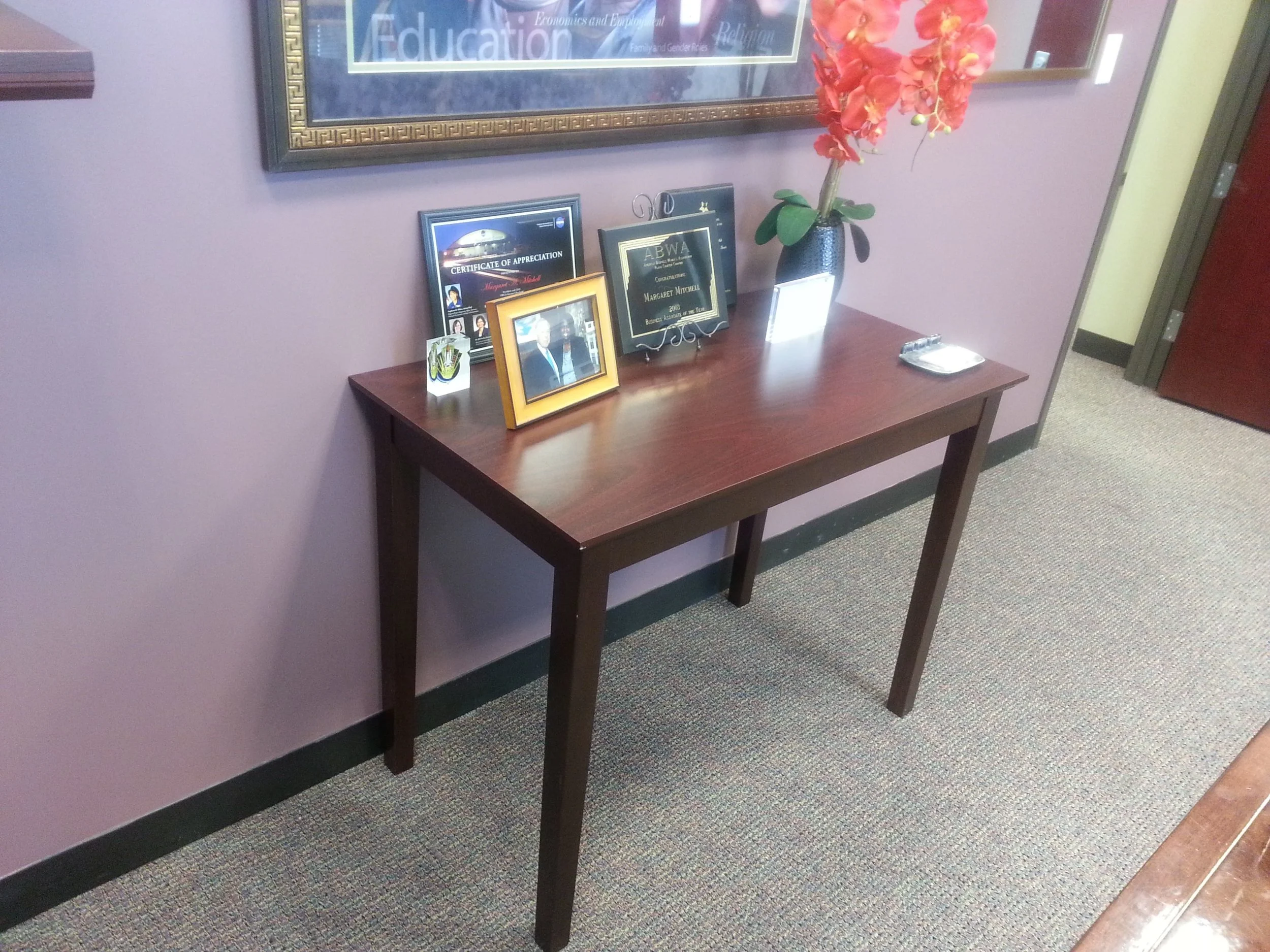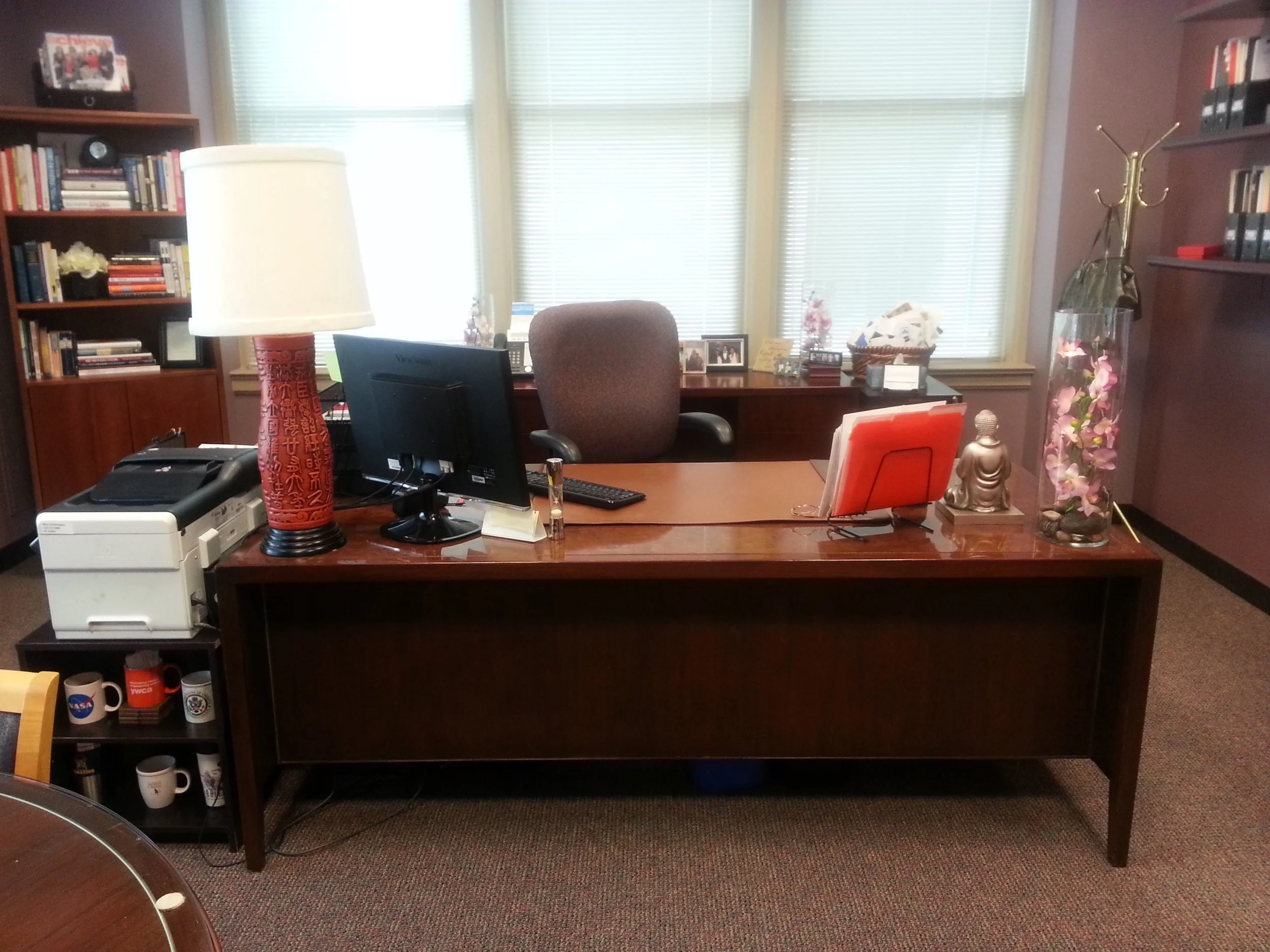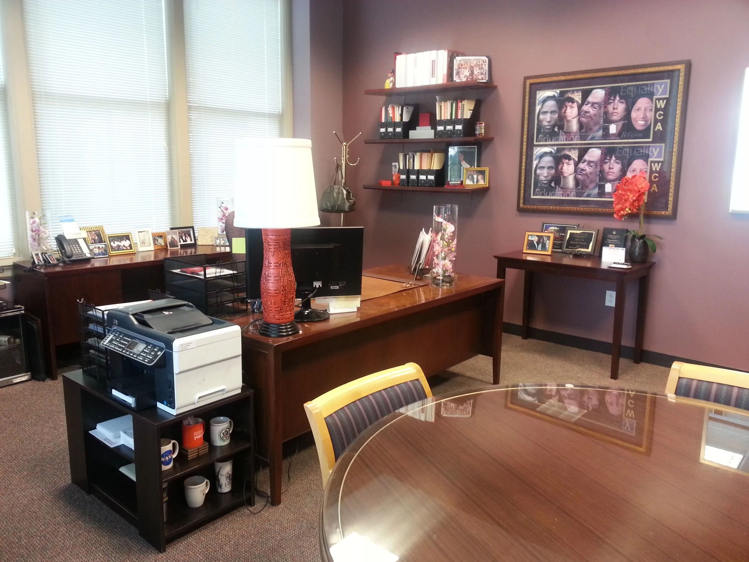 The featured space serves as a meeting and working space for the CEO of the company. We created a functional filing system, an area for meetings, sit-downs and presentations, and finished off the space with personal touches that spoke to the personality of its occupant. What we accomplished was a space that's warm and inviting, but also professional and streamlined.